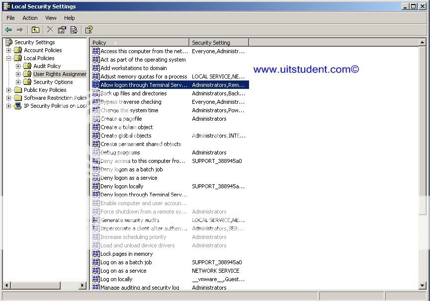 Nếu muốn hệ thống của mình bảo mật hơn,bạn nên thay đổi đặc quyền của những người dùng này thành những tài khoản bình thường trong hệ thống.Bạn đang là người có quyền cao nhất thì k nên đăng nhập từ xa bằng tài khoản của mình mà hãy tạo 1 tài khoản khác ít có khả năng can thiệp sâu vào hệ thống Windows.Vào Run gõ secpol.msc.Trong cửa sổ Local Security Settings chọn Local Policies .Double –Click vào User Right Assignment dc như hình dưới: