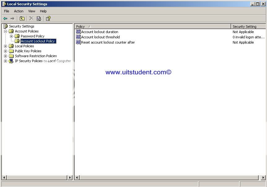 -Có 1 vài tool có khả năng dò tìm password và tài khoản để đăng nhập từ xa.Chúng ta k có khả năng ngăn chặn điều này,nhưng phải hạn chế đến mức thấp nhất bằng cách thiết lập chính sách cụ thể.Nếu một vài người đang cố gắng dò password,sau 1 vài lần đăng nhập k thành công,tài khoản này sẽ bị khóa lại với 1 khoảng thời gian nhất định,vài giờ hay vài ngày…Để thực hiện điều này,từ cửa số Local Security Setting (vào Run gõ secpol.msc).Bạn chọn Account Policies-->Account Lockout Policy.