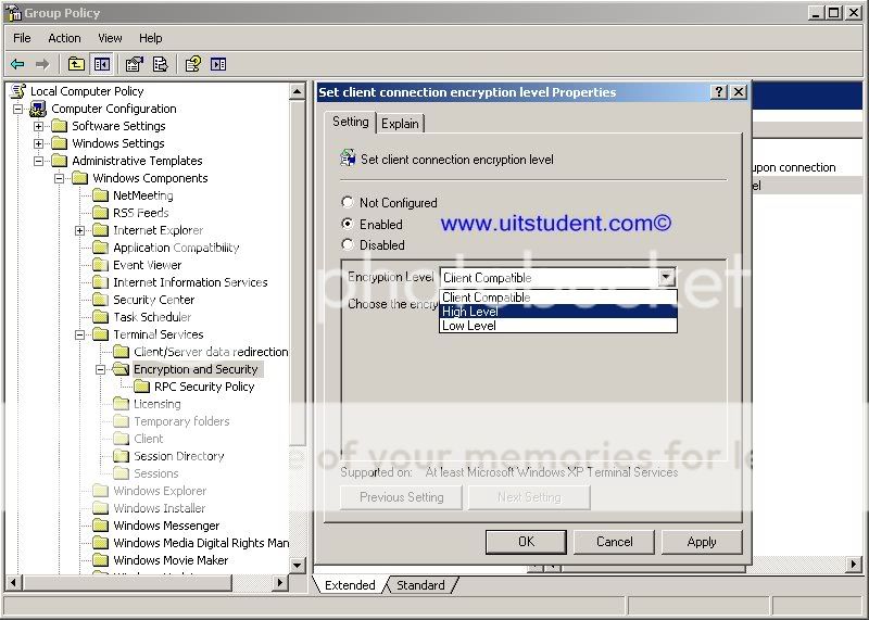 --Thực hiện kết nối trong môi trường Internet và bị đánh cắp password là điều tất dễ xảy ra.Chính vì vậy mã hóa kết nối và mật khẩu ở mức cao nhất là điều cần thiết.Vào Run gõ gpedit.msc.sẽ hiện lên cửa sổ Group Policy.Chọn Computer Configuration-->Administrative Template-->Window Component-->Terminal Services-->Encryption and Security.Double-clik vào Set client connection encryption level rồi chọn như hình dưới
