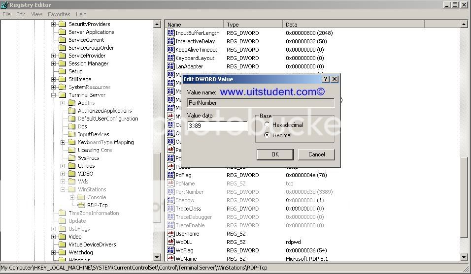 --Run gõ regedit rồi theo đường dẫn sau HKEY_LOCAL_MACHINE\SYSTEM\CurrentControlSet\Contro l\Terminal Server\WinStation\RDP-Tcp\PortNumber.Hãy thay đổi cổng 3389 mặc định của Remote Desktop thành 1 giá trị bất kì.Khi truy cập,thay vì dùng địa chỉ IP của máy,bạn phải thêm dấu 2 chấm và theo sau là cổng giao tiếp mà bạn vừa thay đổi
